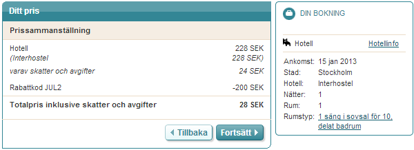 Udostępniony kod rabatowy JUL2 daje nam 95 PLN (200 SEK) rabatu na dowolne hotele w Skandynawii (Dania, Norwegia, Szwecja, Finlandia).