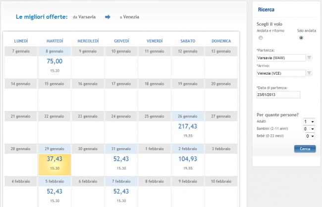 Rzeczywiście – w systemie przewoźnika bilety na trasie Warszawa – Wenecja są niedostępne w okresie od 9 do 25 stycznia 2013, a loty Warszawa – Mediolan są niedostępne od 9 stycznia 2013.