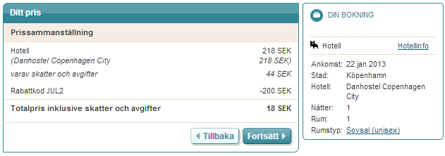 Udostępniony kod rabatowy JUL2 daje nam 95 PLN (200 SEK) rabatu na dowolne hotele w Skandynawii (Dania, Norwegia, Szwecja, Finlandia).