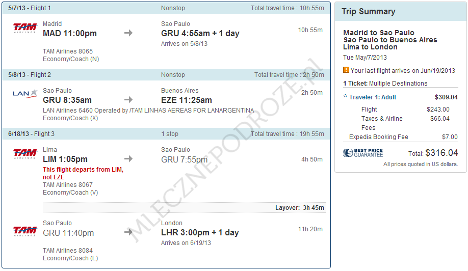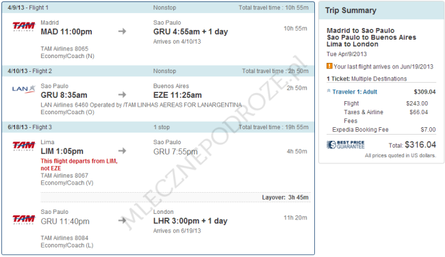 Aby zakupić bilety w serwisie expedia.com korzystamy z opcji „MULTIPLE DESTINATIONS” i wpisujemy odcinki: