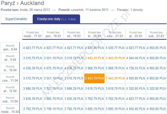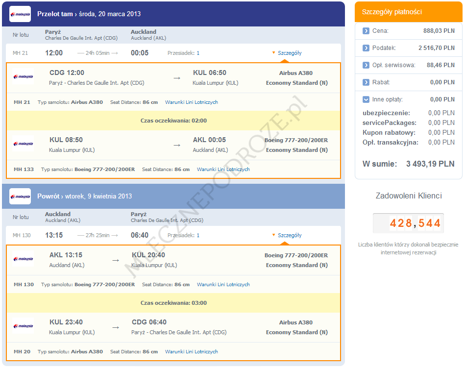 Promocyjne loty są dostępne w terminie od marca do listopada 2013. W każdą ze stron mamy wygodne (2-3 godziny) przesiadki w Kuala Lumpur. Dzięki dużej dostępności lotów możemy prawie dowolnie manipulować długością pobytu w Nowej Zelandii.