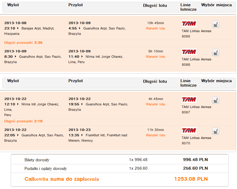Wrócimy dobre ceny lotów TAM Airlines do Ameryki Południowej. Jest kilka kombinacji przelotów i kilka możliwych miejsc docelowych: Lima za 1253 PLN, Lima/Cuzco (Peru) od 1370 PLN, Rio de Janeiro od 1535 PLN, Sao Paulo (Brazylia) od 1419 PLN czy Urugwaj za 2056 PLN
