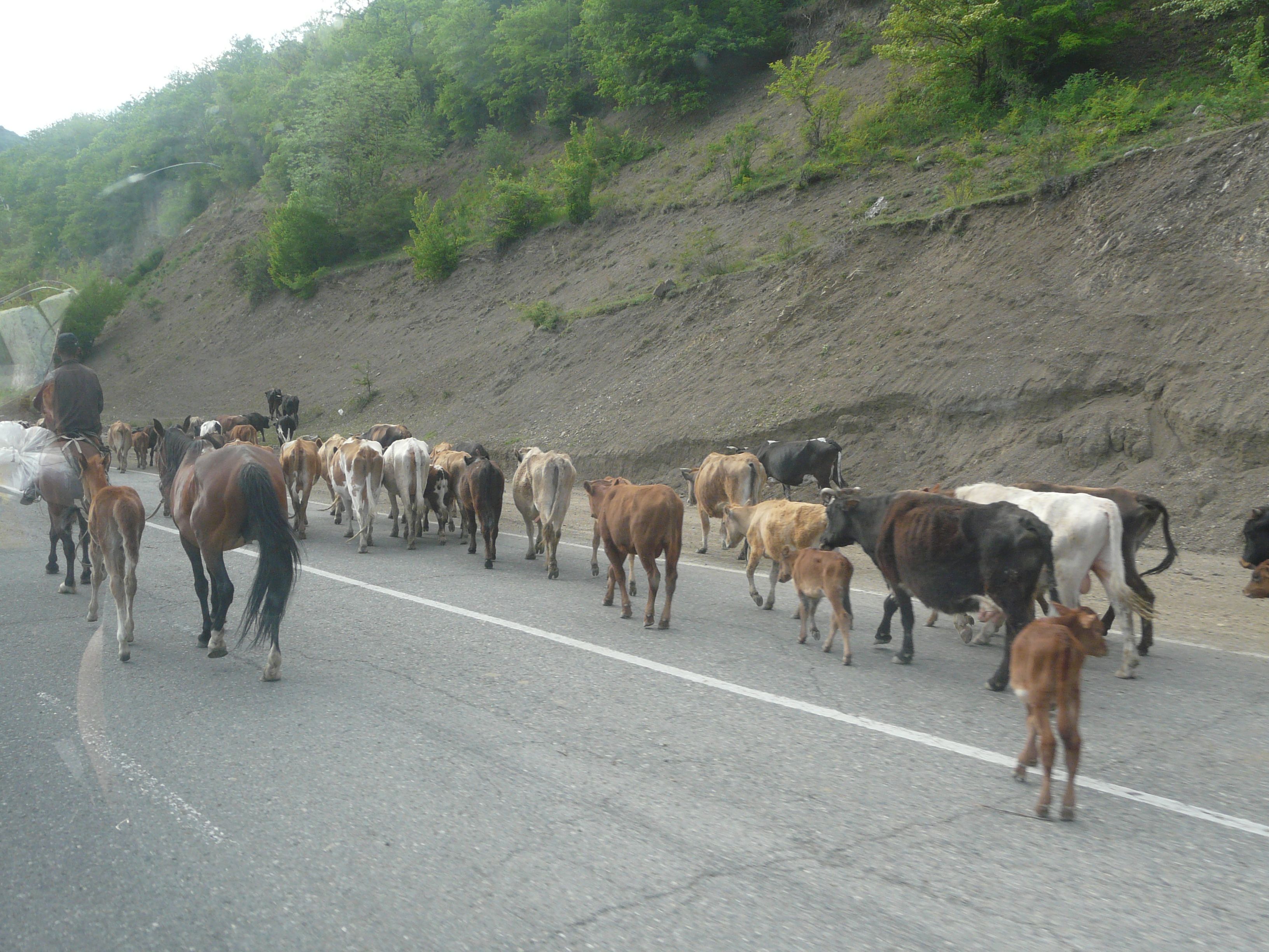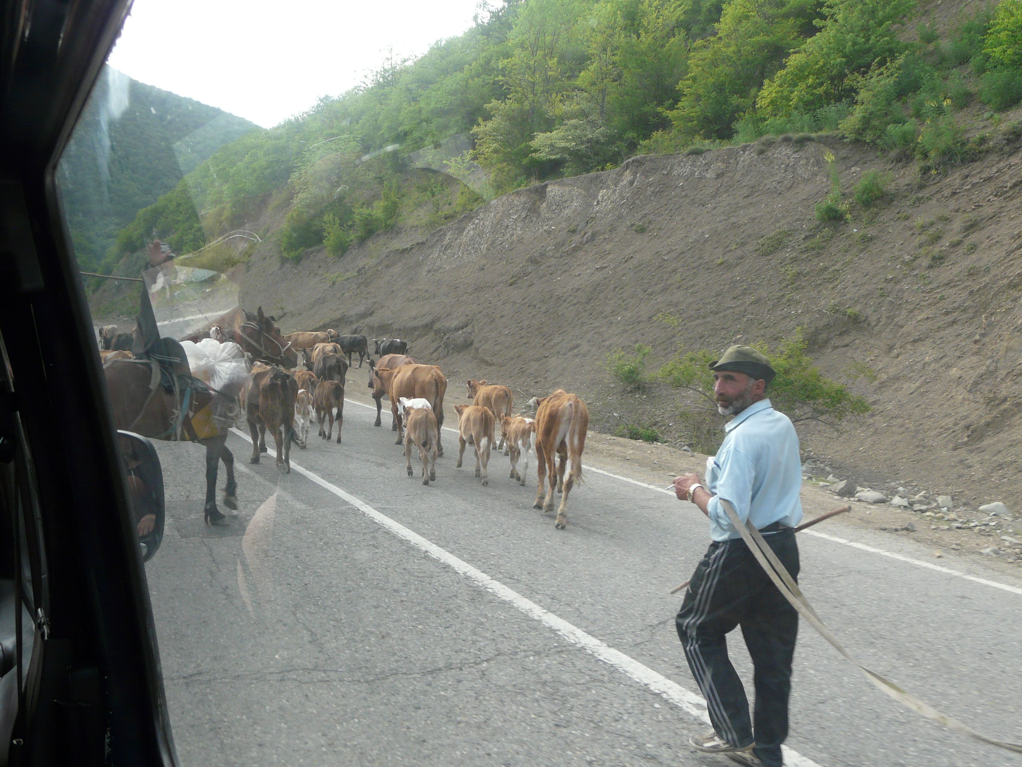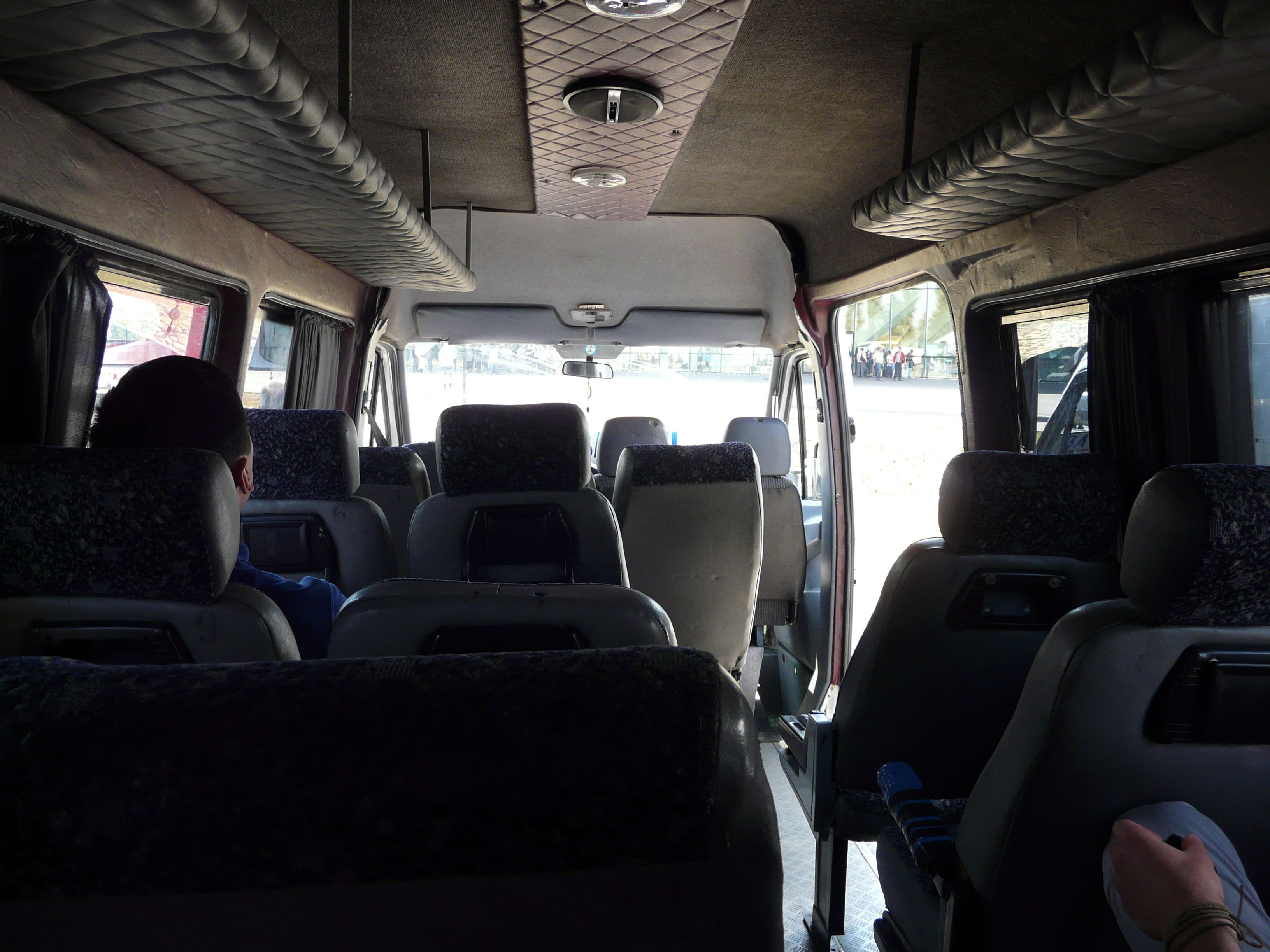 Pakujemy się do jednej z marszrutek, a po chwili zbierania pasażerów ruszamy w drogę. Jedziemy m.in. razem z Tomkiem i Martą (oni też chcą jechać od razu do Kazegi) oraz z Tomkiem i siostrą (ich spotkamy później w Kazbegi)