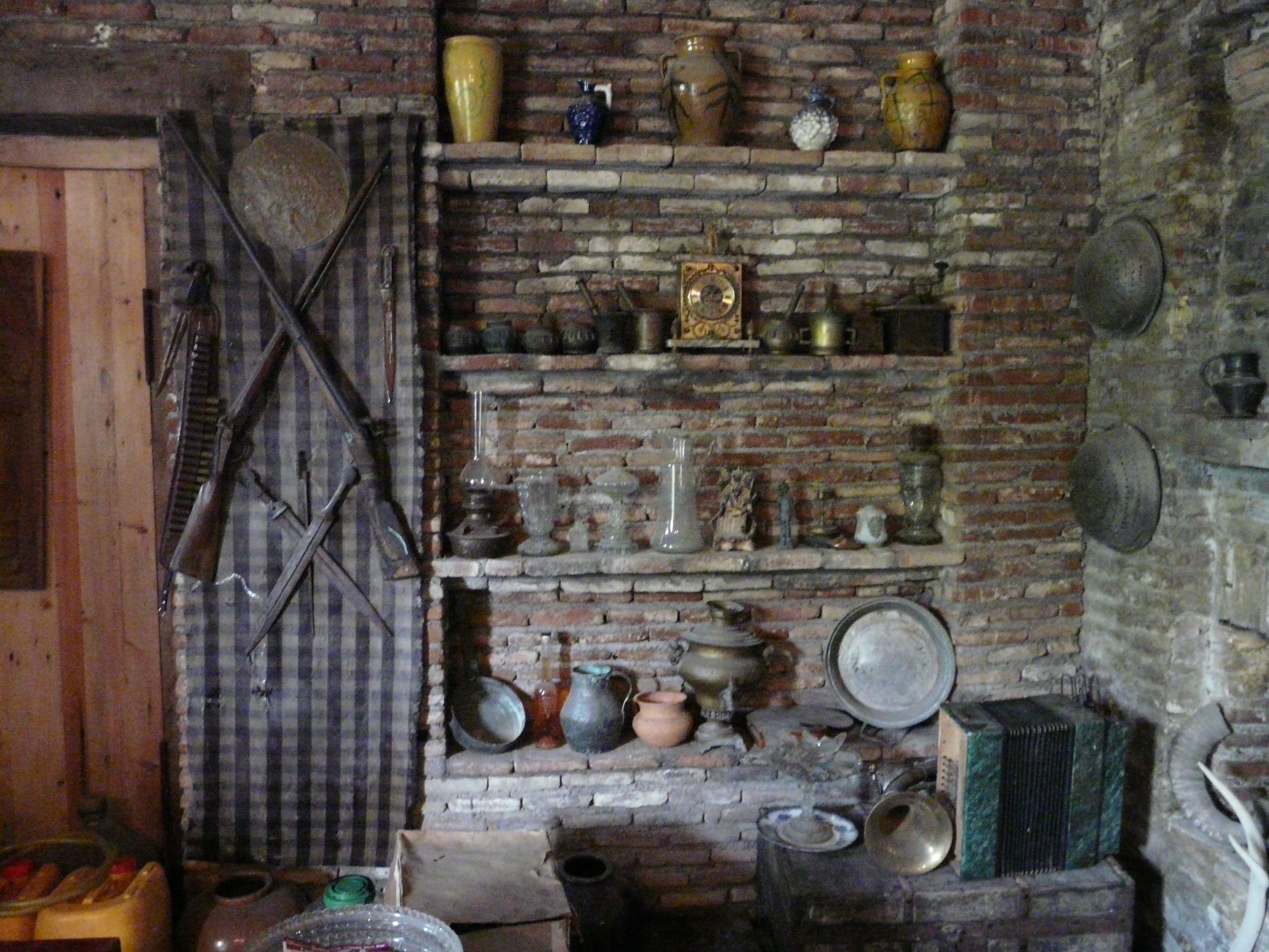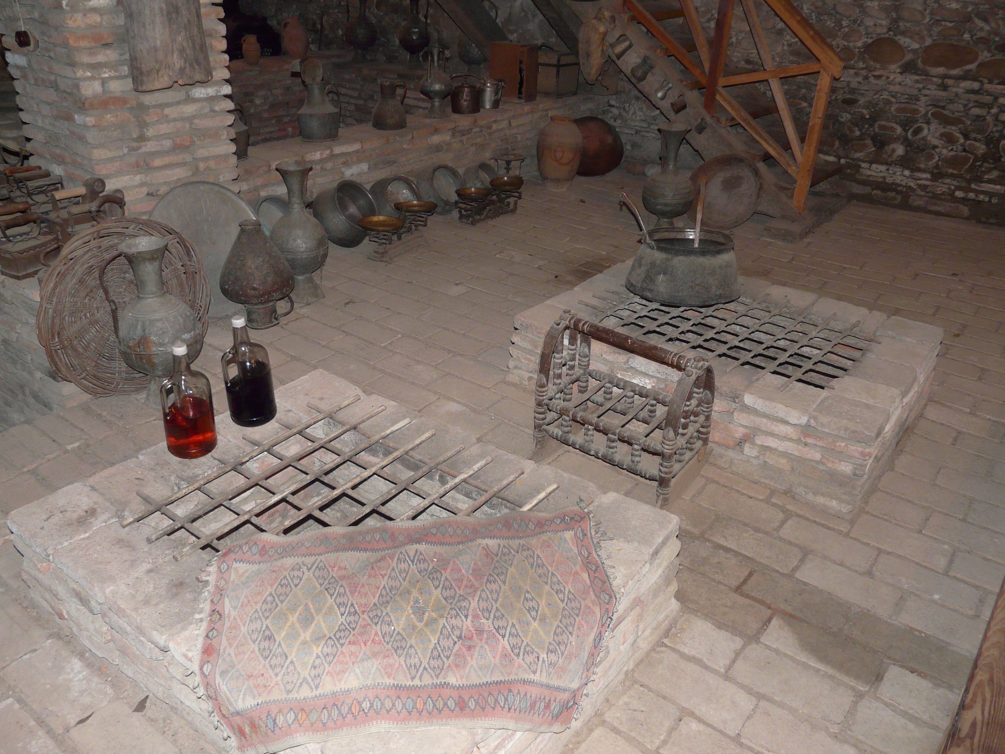 Można tutaj zobaczyć stare rzeczy, takie jak tradycyjne kielichy do wina, żelazka, poduszki, obrazy itp.