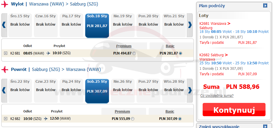 Loty z Warszawy do Salzburga odbywają się raz w tygodniu w soboty w okresie od 11 stycznia do 22 marca 2014.
