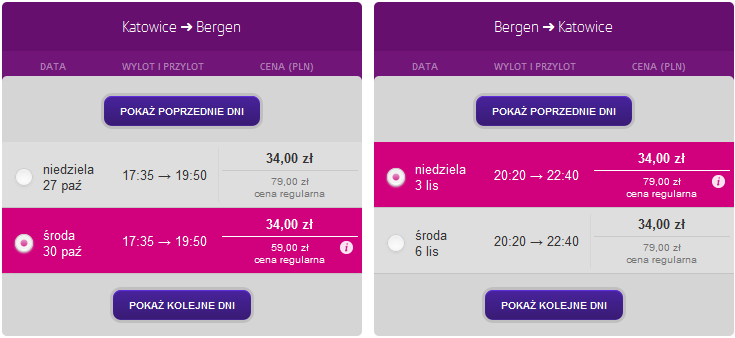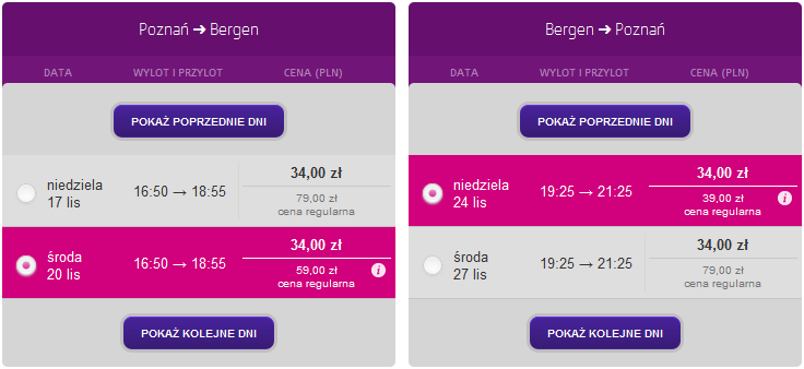 za 34 PLN: 28, 29, 30 sierpnia; 5, 6, 12, 13, 18, 19, 20, 25, 26, 27 września; 3, 4, 9, 11, 16, 17, 18, 23, 24, 25, 29, 30 października; 20, 23, 30 listopada; 29 stycznia