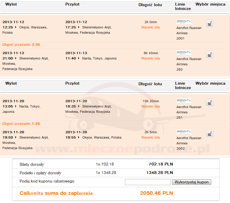 Podróż odbywamy z wygodną kilkugodzinną przesiadką w Moskwie. Dolot z Warszawy obsługuje Aeroflot albo PLL LOT. Loty na trasie Moskwa – Tokio obsługiwane są przez Aerofłot.