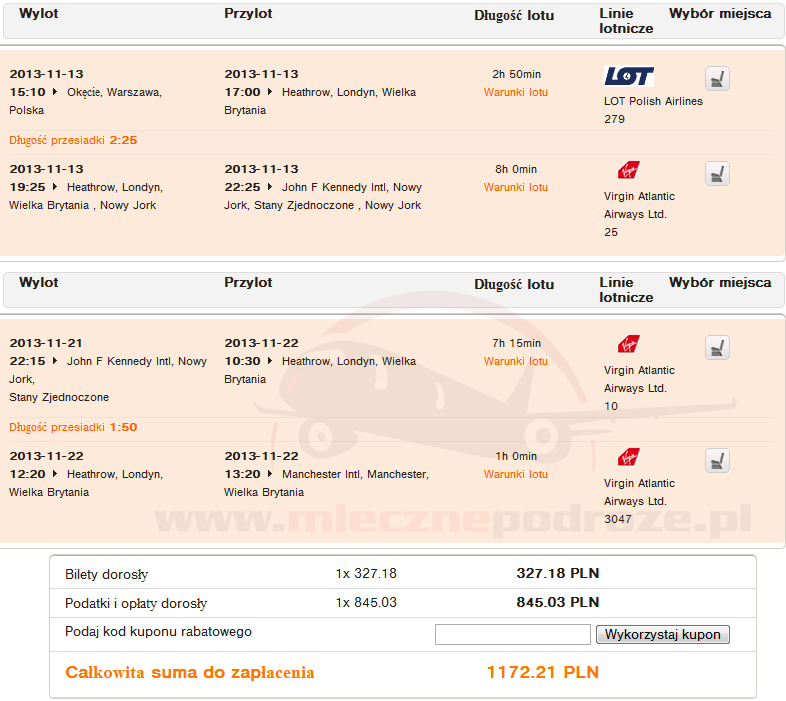 Dolot do Londynu odbywa się na pokładzie PLL LOTu, resztę lotów wykonują linie Virgin Atlantic. Podróż możemy zakończyć w Londynie, należy jednak pamiętać, aby nadać bagaż tylko do Londynu.