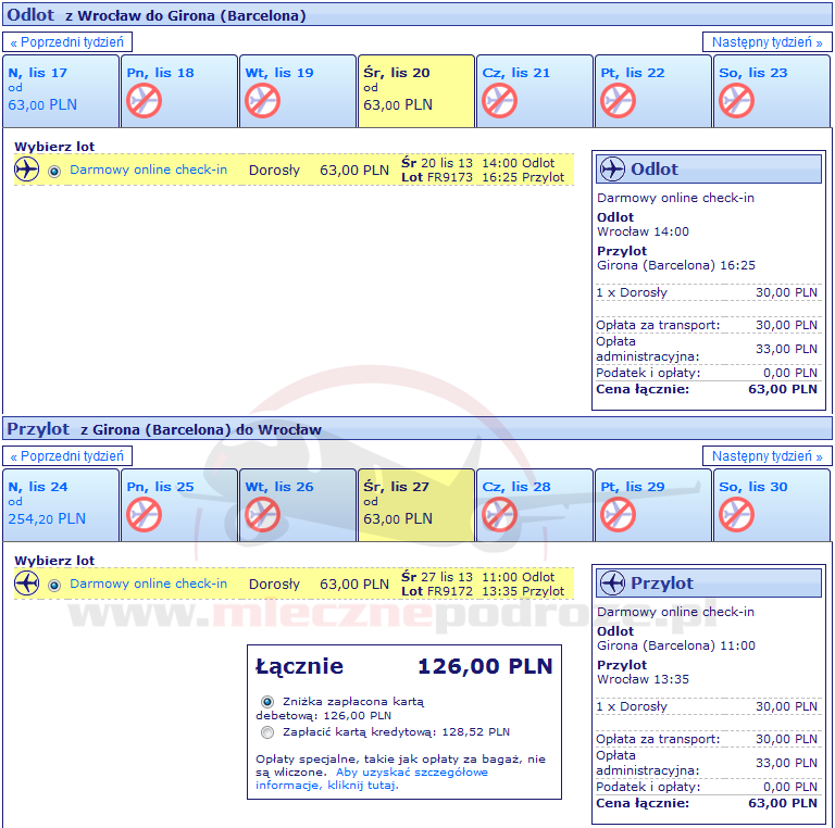 W najniższej cenie 63 PLN w jedną stronę znajdziemy kilka terminów: