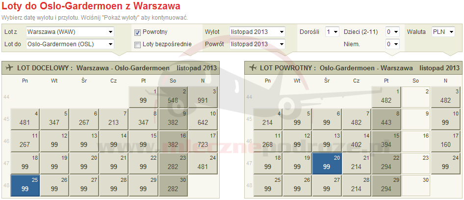 Ciekawa alternatywa dla przelotów Wizz Air i Ryanair. Za loty liniami Norwegian z Gdańska i Warszawy do Oslo (Gardermoen, nie Rygge czy Torp) zapłacimy od 198 PLN w dwie strony. Trochę wiecej zapłacimy za loty z Krakowa. W niskiej cenie dostępne jest mnóstwo terminów od listopada 2013 aż do marca 2014.