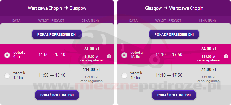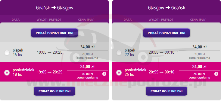 za 34 PLN: 15, 18, 22, 25, 29 listopada;