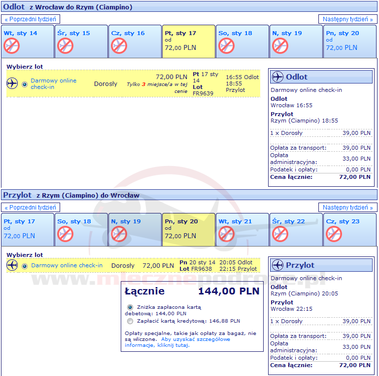 Podana cena dotyczy płatności kartą kartą debetową oraz podróży tylko z bagażem podręcznym (waga do 10 kg, wymiary 55x40x20cm). Płatność kartą kredytową obciążona jest dopłatą w wysokości 2% ceny biletu. Bilety kupujemy na stronie przewoźnika: ryanair.com