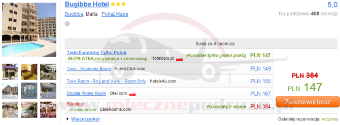 Znany Bugibba Hotel kosztuje tylko 147 PLN za 4 noce dla 2 osób, czyli niecałe 19 PLN/os/doba! (w przykładowym terminie 21-25 listopada)