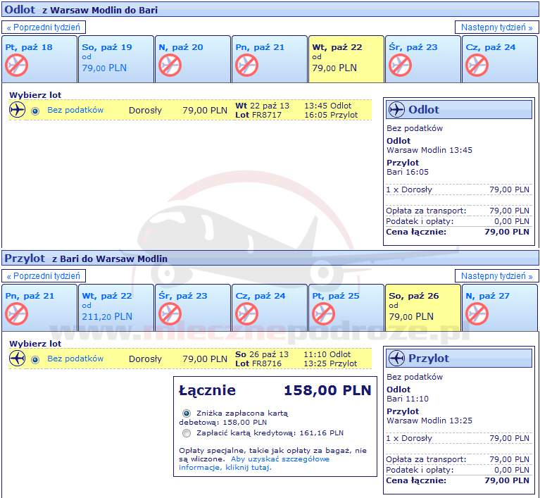 Podana cena dotyczy płatności kartą kartą debetową oraz podróży tylko z bagażem podręcznym (waga do 10 kg, wymiary 55x40x20cm). Płatność kartą kredytową obciążona jest dopłatą w wysokości 2% ceny biletu. Bilety kupujemy na stronie przewoźnika: ryanair.com