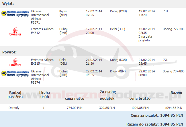 Najtańsze przeloty na trasie Kijów – Delhi znajdziemy w wielu terminach między styczniem a kwietniem 2014. Bilety rezerwujemy na empiktravel.pl lub poprzez kalendarz terminów