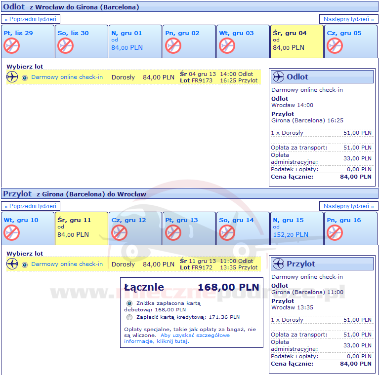 W najniższej cenie 84 PLN w jedną stronę znajdziemy kilka terminów: