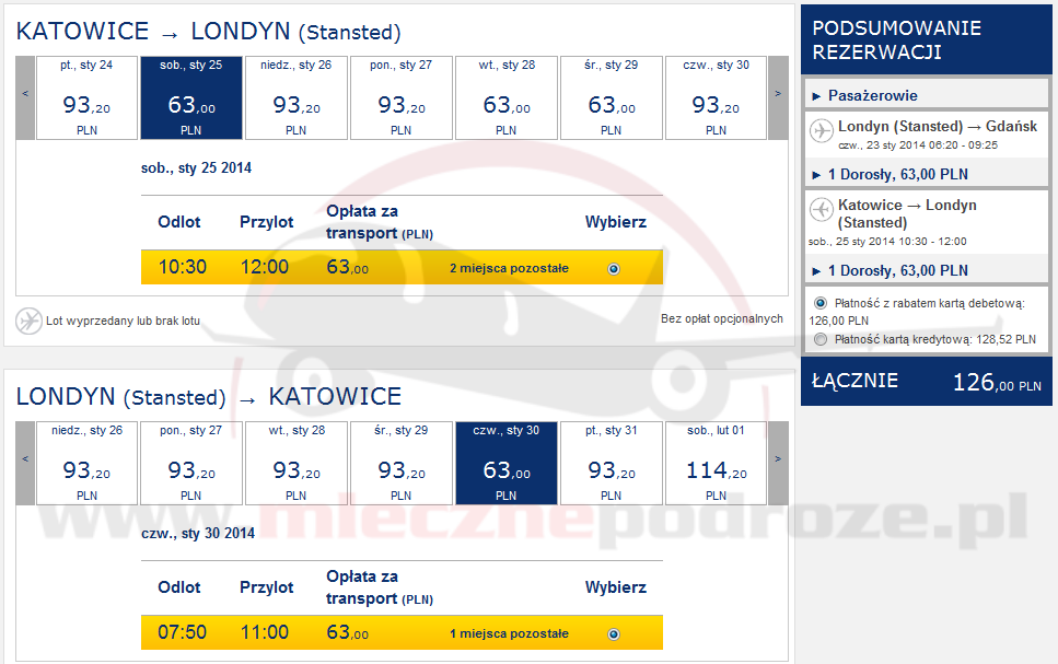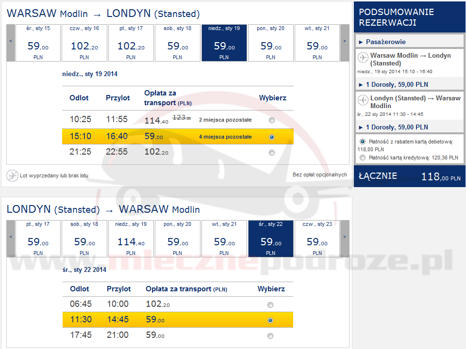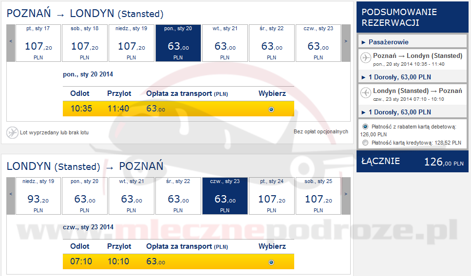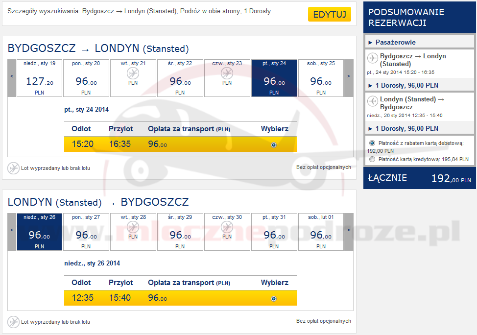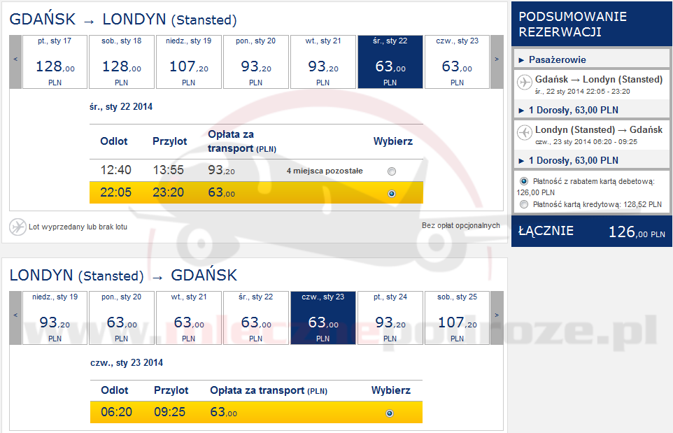 Podana cena dotyczy płatności kartą kartą debetową oraz podróży tylko z bagażem podręcznym (waga do 10 kg, wymiary 55x40x20cm). Płatność kartą kredytową obciążona jest dopłatą w wysokości 2% ceny biletu. Bilety kupujemy na stronie przewoźnika: ryanair.com