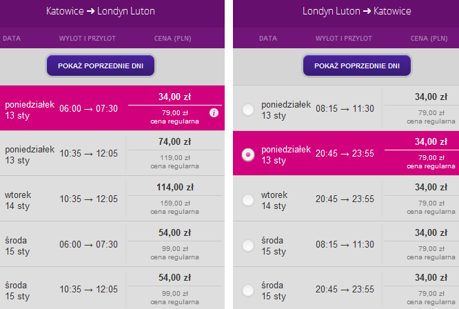 Jednodniówkę za 68 PLN znajdziemy 13 stycznia, wylatujemy rano, wracamy wieczorem – dzięki temu mam dużo czasu na zwiedzanie. Możemy też zostać w Londynie i wrócić 14 czy 15 stycznia.