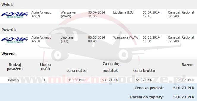 Może i cena nie jest najniższa, bo tanimi liniami z przesiadkami można dolecieć taniej. Ale… lecimy bezpośrednio z Polski i to w dodatku z bagażem w cenie! A przy okazji pierwszy raz u nas pojawia się Adria Airways: za przeloty z Warszawy do Lublana (Słowenia) zapłacimy od 519 PLN!