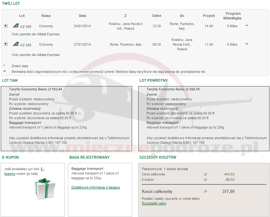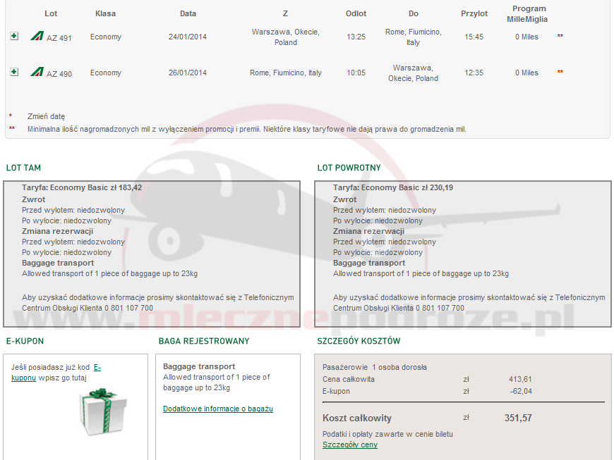 15% zniżki dotyczy wszystkich krajowych i międzynarodowych lotów Alitalia (włączając loty Air One) z wyjątkiem lotów do Francji, Holandii, Zjednoczonych Emiratów Arabskich (Abu Dhabi) oraz lotów międzykontynentalnych. Oferta dotyczy wylotów z Polski na podróż pomiędzy 23 listopada 2013 r., a 31 stycznia 2014 r. (ostatnia możliwa data powrotu).