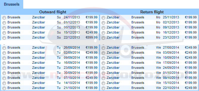 Bruksela – Zanzibar: 24 listopada; 1, 8 grudnia; 26 sierpnia; 9, 16, 23, 30 września; 14, 21 października
