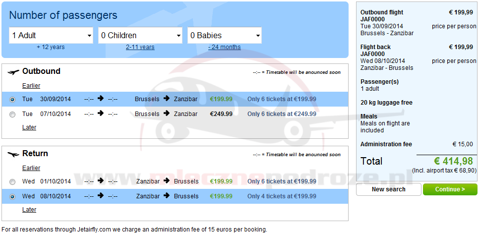 Dobra cena lotów Jetairfly z Brukseli na Zanzibar. Za przeloty ze stolicy Belgii zapłacimy 415 EUR (1740 PLN) w dwie strony. Do tego dodajemy dolot tanimi linami do Brukseli Charleroi już od 38-68 PLN w dwie strony (z lotniska do Brukseli pojedziemy już za 5 EUR!)