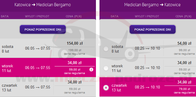 Przykładowe terminy za 68 PLN w dwie strony:
