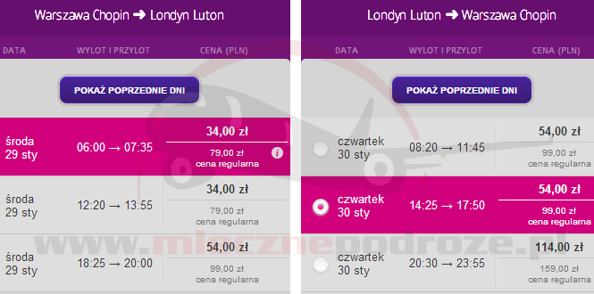Przykładowe tanie loty z Warszawy Chopin do Londynu Luton za 88 PLN w dwie strony: