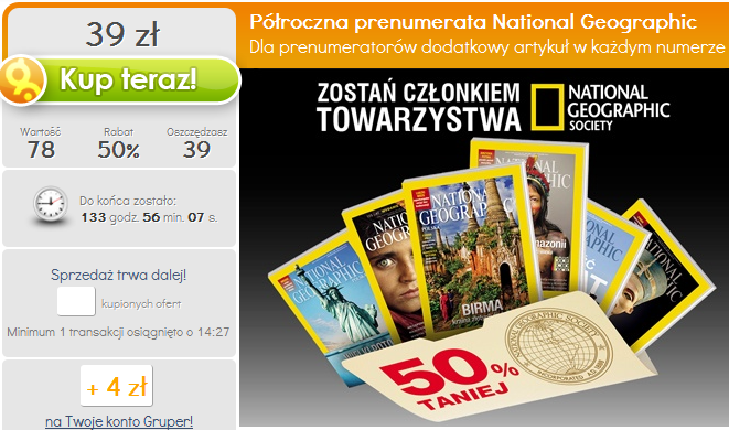 Dawno nie było żadnej prenumeraty w promocji. Na Gruperze można kupić półroczną prenumeratę National Geographic za 39 PLN (wraz z darmową wysyłką). Prenumerata startuje od numeru 3/2014.