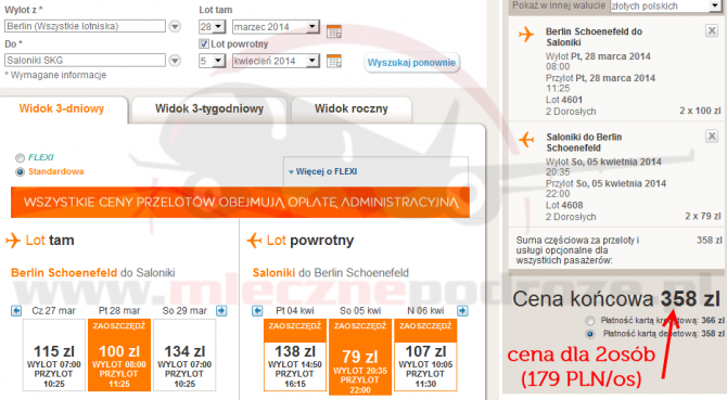Jeszcze jedna bardzo fajna cena na greckim kierunki w easyJet. Za przeloty na trasie Berlin – Saloniki zapłacimy tylko 179 PLN/os w dwie strony! Tak tanie loty znajdziemy na przełomie marca i kwietnia 2014.