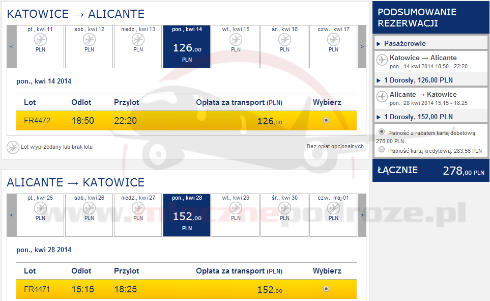 Loty z Katowic do Alicante w najniższej cenie 278 PLN w dwie strony znajdziemy tylko w jednym terminie: 14-28 kwietnia 2014.