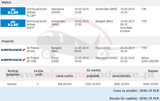 Wojna o Bangkok :) Po niedawnej ofercie Qatar Airways dobrą ceną lotów do Tajlandii oferuje AirFrance/KLM. Za przeloty z Warszawy do Bangkoku zapłacimy 1877 PLN. Bilety można kupić na stronie empiktravel.pl lub poprzez kalendarz flipo.pl
