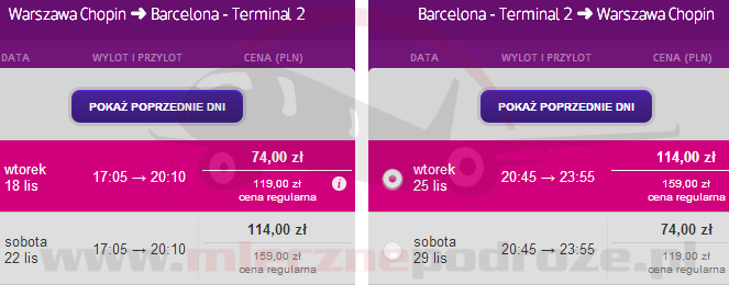 W cenie 148 PLN w dwie strony znajdziemy dużo terminów od listopada 2014 do marca 2015.